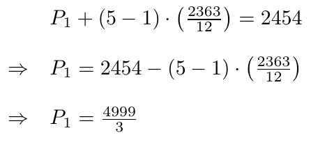 A partir de esta ecuación podemos despejar I, para obtener que I = \frac{ -2363 }{ -12 } = \frac{2363}{12} y sustituirlo en la ecuación de nuestra preferencia para calcular P_1.