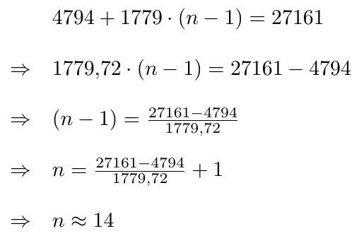 Nuestro propósito es determinar el valor de n para el cual P_n= 27161 , es decir, para el cual 4794 -37 \cdot (n -1) = 27161 y para esto, despejamos n.