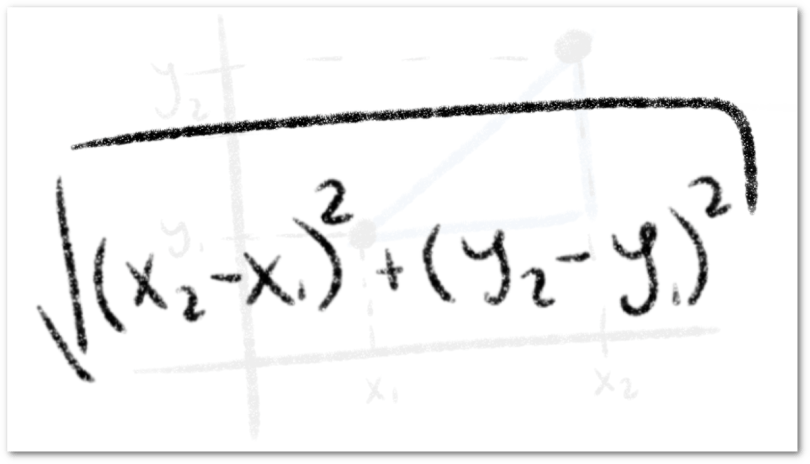 Tomando esto en cuenta, podemos aplicar el Teorema de Pitágoras, pues la distancia es la medida de la hipotenusa. Entonces, tenemos que \textit{el cuadrado de la hipotenusa será igual a la suma de los cuadrados de los catetos}, es decir,
