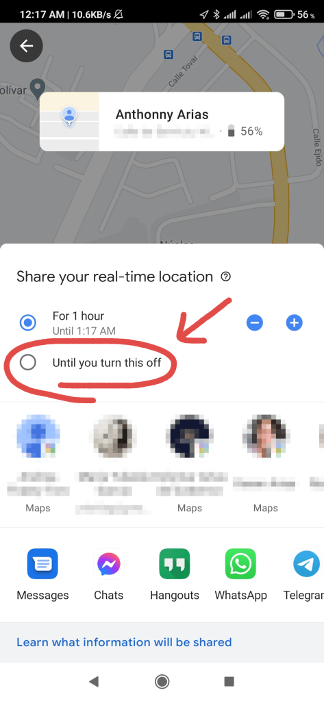 Seleccionan la cantidad de tiempo por la que quieran compartir su ubicación, en mi caso particular, seleccioné la opción «until you turn this off» (hasta que lo apague) para compartir mi ubicación con todo mi núcleo familiar.
