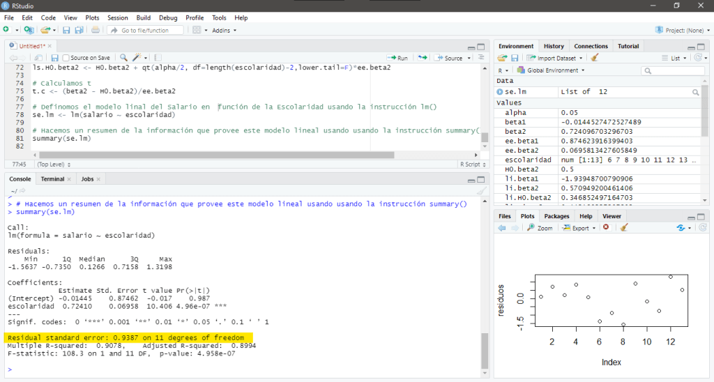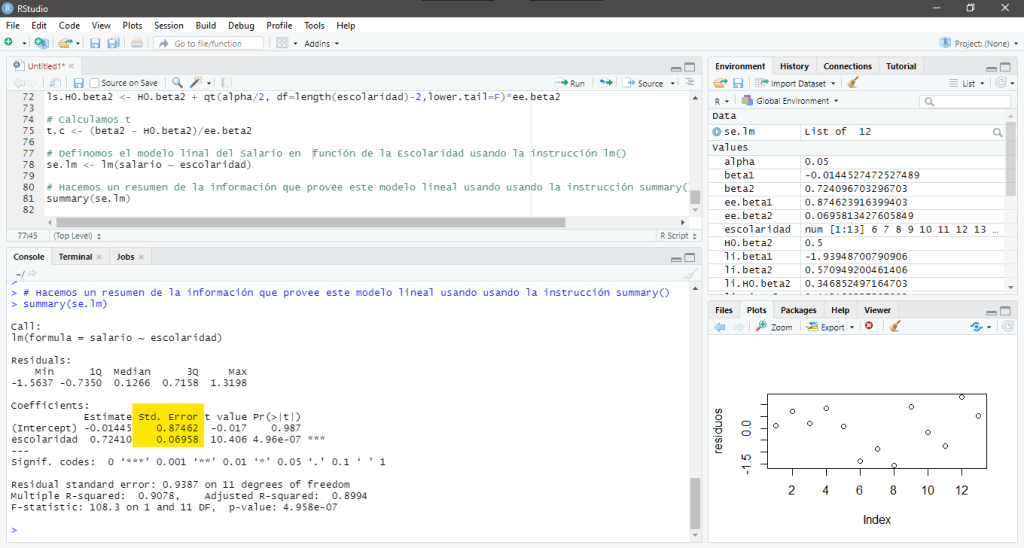 Definimos un modelo lineal que describe el salario en función de la escolaridad con la instrucción lm() y almacenamos esta información en la variable se.lm usando la siguiente sintaxis: