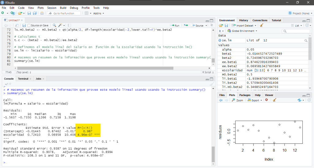 - Pr(>|t|) – p-value correspondiente la prueba t de cada estimador.